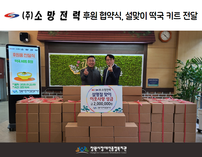 1월 22일 수요일, (주) 소망전력에서 복지관으로 방문하여 후원 협약을 체결하며 200만원 상당의 떡국 키트를 전달하였습니다.(주)소망전력은 2019년부터 첫 후원을 시작으로 명절 뿐 아니라 저소득 가정 LED 전등 교체, 주거 환경 개선 사업 등 다양하고 지속적인 사업으로 복지관과 인연을 이어오고 있습니다.떡국 키트는 (주)소망전력에서 보내주신 따뜻한 ...