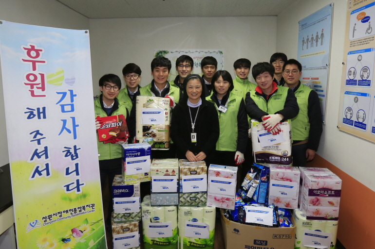 [2016. 01. 28. 현대위아 신입직원 봉사활동 및 저소득 장애인을 위한 후원활동] 일시 : 2016. 01. 28 09:00~12:00인원 : 현대위아 신입직원 32명장소 : 창원시장애이종합복지관 내내용 : 장애오감체험, 자원봉사활동(장애인 목욕탕 청소, 관내외 환경미화), 장애인을 위한 생필품 후원