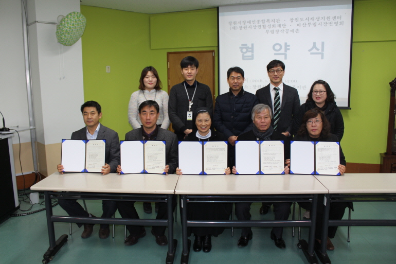 21(목), 창원시장애인종합복지관, 창원도시재생지원센터, (재)창원시상권활성화재단, 마산부림시장번영회, 부림창작공예촌은 우호관계를 확인하고 상호간의 신뢰를 바탕으로 업무협력에 기여할 것을 확인하면서 업무협약을 체결햇습니다.