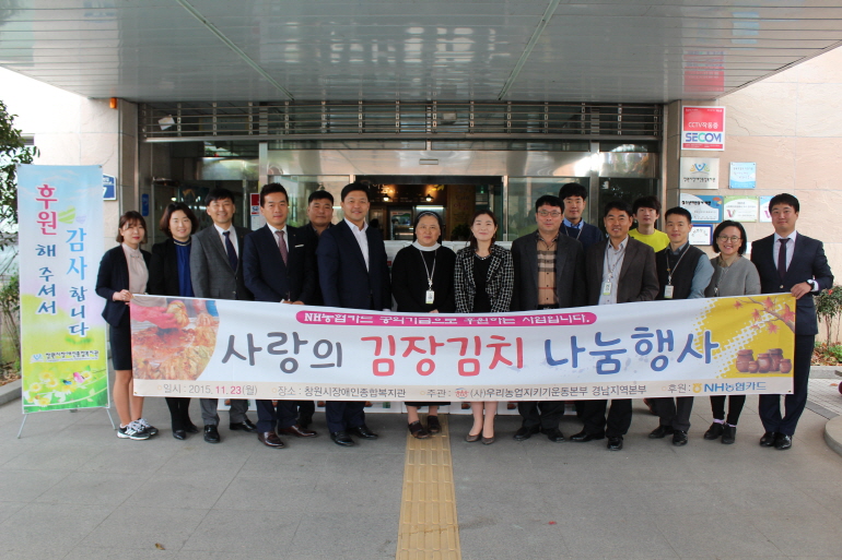 한화테크윈이 후원하고 경상남도자원봉사센터에서 주최하는 『사랑의 김장나누기』에서 김장김치 200 BOX, NH농협카드가 후원하고 (사)우리농업지키기운동본부 경남지역본부에서 주최하는『사랑의 김장김치 나누기』150 BOX, 창원시자원봉사협의회에서 50 BOX, 경남은행에서 김장김치 10 BOX, 동창원농협에서 10 BOX, 박성호 국회의원 4 BOX, 총 424 BOX를 저희 복지관에 후원하여 주셨습니다.