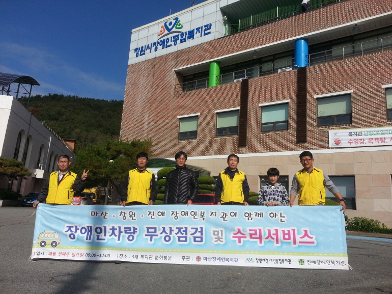 마·창·진 장애인복지관 공동사업의 일환으로 매월 셋째 주 일요일 순회실시 되는 장애인차량무상점검 및 수리서비스가 지난 11월15일 우리복지관 앞마당에서 올해 마지막 나누기(나눔을 주는 기술인) 봉사회의 봉사 나눔으로 진행되었습니다.