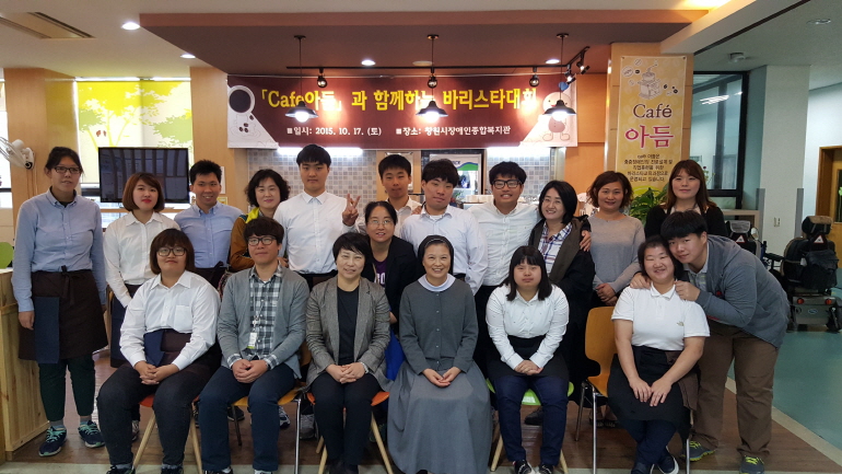 지난 토요일 “2015 제1회 카페아듬과 함께하는 바리스타대회”가 개최되었습니다. 카푸치노 2잔과 자유메뉴1잔을 제한시간 내에 만들어내 맛과 향미, 출전자들의 에티켓 등을 평가하여 공정한 심사를 통해 우수상 영자매팀(노미영, 신가영), 준우수상 김진환, 차태양팀, 관객호응상 이도경, 이수성팀, 최고팀웍상 이현화, 황희연팀, 예쁜카푸치노상 무지개팀(백찬우, 김연지) 총 5개 팀이 수상을 하였습니다. 이번 대회를 통해 바리스타를 꿈꾸며 노력하고 있는 예비 바리스타들이 색다른 경험과 할 수 있다는 성취감, 자신감을 느낄 수 있는 하루였길 바랍니다. 이날 대회 심사위원으로는 창원시장애인종합복지관 정영숙관장님 외 다인스커피 전남이 대표님, 직원지원팀 이동욱 대리님이 함께 해 주셨습니다.