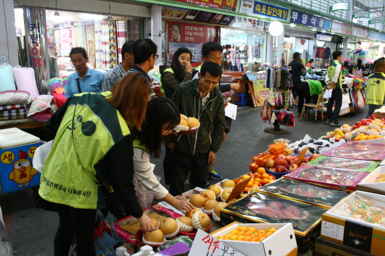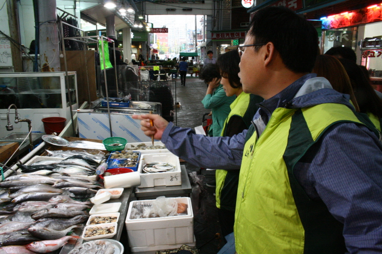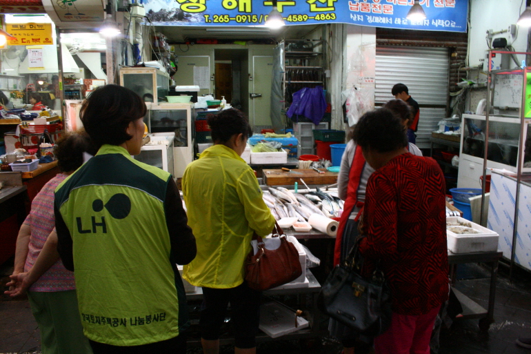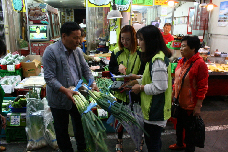 장애인분들이 필요한 품목을 직접 골라 작성하고 LH한국토지주택공사 경남지역본부 직원분들과 함께 명서시장에서 장을 보았습니다.