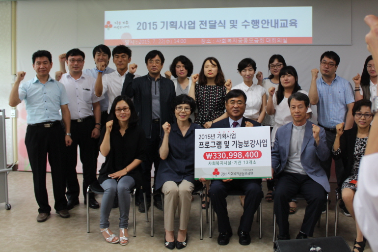 사회복지공동모금회에서 2015년 경남사회복지공동모금회 기획사업 "발달장애 아동 및 청소년의 신체활동 참여증진과 사회성 향상을 위한 지역사회 연계 대그룹 특수체육 관계형성 프로그램 모델 구축 및 보급사업" 수행을 위한 배분금 전달식 및 안내교육이 있었습니다.