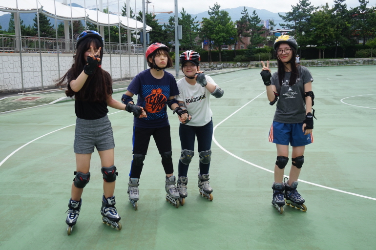 7월 25일 통합체육교실에 참여하는 장애 비장애학생들이 인라인스케이트를 타고왔습니다.