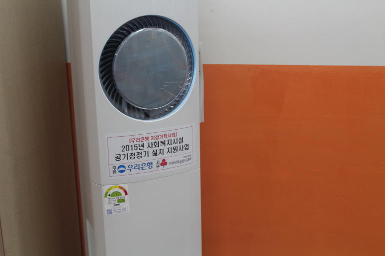 우리은행에서 후원하고 사회복지공동모금회에서 지원하는 “2015년 사회복지시설 공기청정기 설치 지원사업“에 우리복지관이 지정기탁기관으로 선정되어 지하 작업활동실에 공기청정기를 설치했습니다.