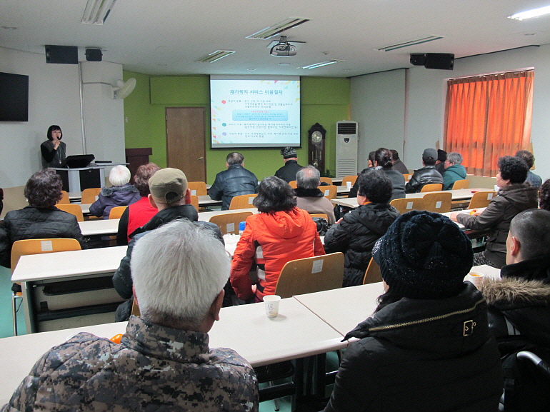 [2015. 02. 27 재가복지사업 설명회 및 인권교육 실시]2015년 재가복지사업 설명회 및 인권교육을 실시하였습니다.복지관에서 실시하고 있는 재가복지사업과 2015년 신규사업을 안내하고 재가복지서비스 이용자들의욕구파악을 하는 시간을 가졌으며, “장애인인권과 장애특성”이라는 주제로 경남장애인인권포럼 대표문숙현 강사님의 인권교육이 있었습니다. 2...