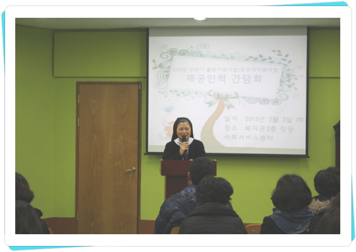 [2015. 02. 03 사회서비스 제공인력 보수교육 및 간담회 실시]2015년 2월 3일(화) 오전 10시와 오후 6시 두 타임으로 나누어 활동지원사업과 도우미지원사업에 참여하고 있는 제공인력 보수교육 및 간담회를 가졌습니다. 계약서 작성과 2015년 변경되는 사업내용에 대한 안내, 올바른 활동과 서비스관련 내용으로 실시가 되었습니다. 항상 더 나은...