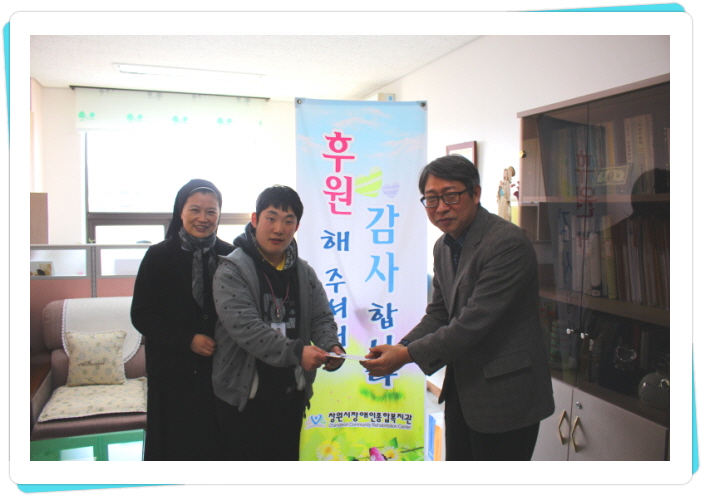 [2015. 02. 11 한국장애인고용공단 경남지사 후원금 전달]설명절을 맞아 한국장애인고용공단 경남지사에서 직원모금으로 모은 모금액을 우리 복지관 보호작업 훈련생을 대상으로 온누리 상품권으로 전달해 주셨습니다.한국장애인고용공단 경남지사 직원여러분의 따뜻한 마음 잘 받았습니다.후원해주셔서 감사합니다.