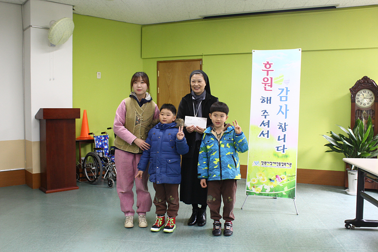 창원해돋이유치원에서 원아 및 교직원들이 저소득 장애인들의 따뜻한 겨울나기 성금으로 모은 금액 100만원을 전달...