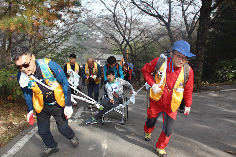 울긋 불긋하게 잘 차려입은 가을 산을 오르는 즐거움은 우리 모두에게 큰 기쁨과 힘이 되어주는데요. 장애인들도 마찬가지로 산에 오르는 즐거움을 누리고 싶은데 현실은 그렇지 못하지요. 이렇게 해서 시작된 장애인등반대회, 1년에 한번 산 정상에 도전하는 뜻깊은 행사라 할 수 있습니다.