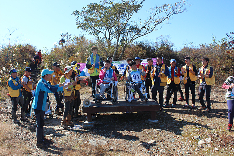 울긋 불긋하게 잘 차려입은 가을 산을 오르는 즐거움은 우리 모두에게 큰 기쁨과 힘이 되어주는데요. 장애인들도 마찬가지로 산에 오르는 즐거움을 누리고 싶은데 현실은 그렇지 못하지요. 이렇게 해서 시작된 장애인등반대회, 1년에 한번 산 정상에 도전하는 뜻깊은 행사라 할 수 있습니다.