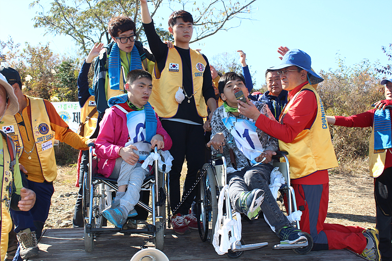 장애인이 탄 휠체어를 라이온스 회원과 가족들이 앞에서 끌고 뒤에서 밀어주어서 힘이 들었지만 기쁨은 누구보다 클 것입니다.