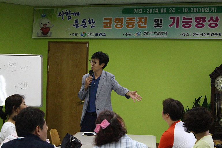 요즘 장애인이나 노인들이 노화와 운동부족으로 인한 근력 손실 때문에 균형감각과 낙상 위험을 초래하는데요. 이를 예방하고 지연할 목적으로 간단한 운동프로그램을 습득하여 지속적인 병행을 통해 낙상 예방에 도움을 주고자 창원시보건소가 주최, 저희 복지관이 주관, 경남대학교 스포츠학과 백운효 교수님의 교육으로 「균형증진 및 기능향상 교실」을 9.24~10.29까지 10회기동안 진행하게 되었습니다.