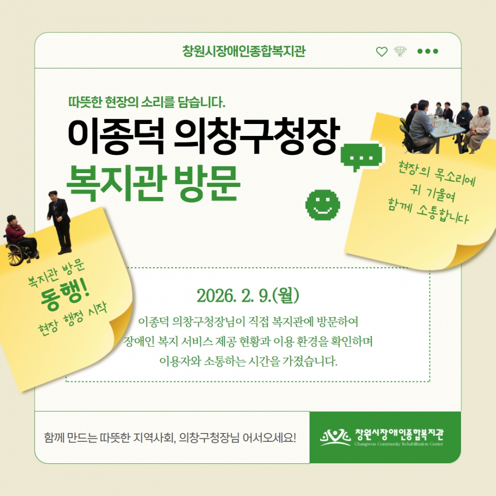 2026년 2월 9일 월요일, 창원시장애인종합복지관에 반가운 손님이 찾아오셨습니다. 바로 이종덕 의창구청장님인데요!