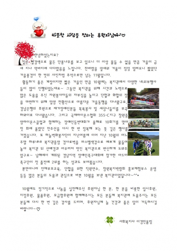 2014년 11월 후원감사편지입니다. 페이지 정보 작성자 이경민 댓글 0건 조회 7,317회 작성일 14-11-14 10:04 본문 늘 감사드립니다.♡ 이전글2014년 11월 후원해주신분들입니다~ 14.12.10 다음글2014년 10월 후원해주신분들입니다~ 14.11.14 목록 댓글목록 댓글목록 등록된 댓글이 없습니다.