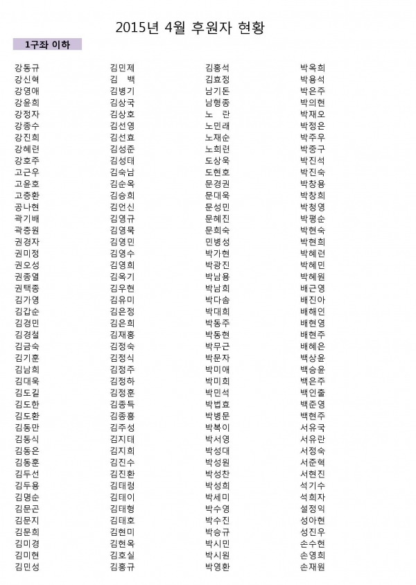 2015년 4월 후원해주신분들입니다. 페이지 정보 작성자 신효진 댓글 0건 조회 6,644회 작성일 15-05-18 11:27 본문 후원해주셔서 감사합니다 ^^ 이전글2015년 5월 후원감사편지입니다. 15.05.21 다음글2015년 4월 후원감사편지입니다. 15.04.20 목록 댓글목록 댓글목록 등록된 댓글이 없습니다.