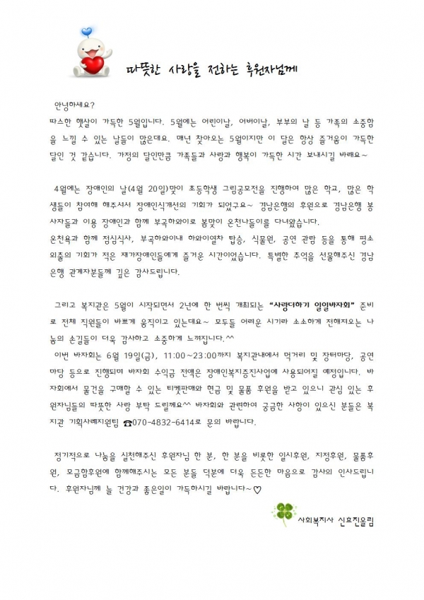 2015년 5월 후원감사편지입니다. 페이지 정보 작성자 신효진 댓글 0건 조회 7,594회 작성일 15-05-21 15:59 본문 후원해주셔서 감사합니다.^^ 이전글2015년 5월 후원해주신분들입니다. 15.06.19 다음글2015년 4월 후원해주신분들입니다. 15.05.18 목록 댓글목록 댓글목록 등록된 댓글이 없습니다.