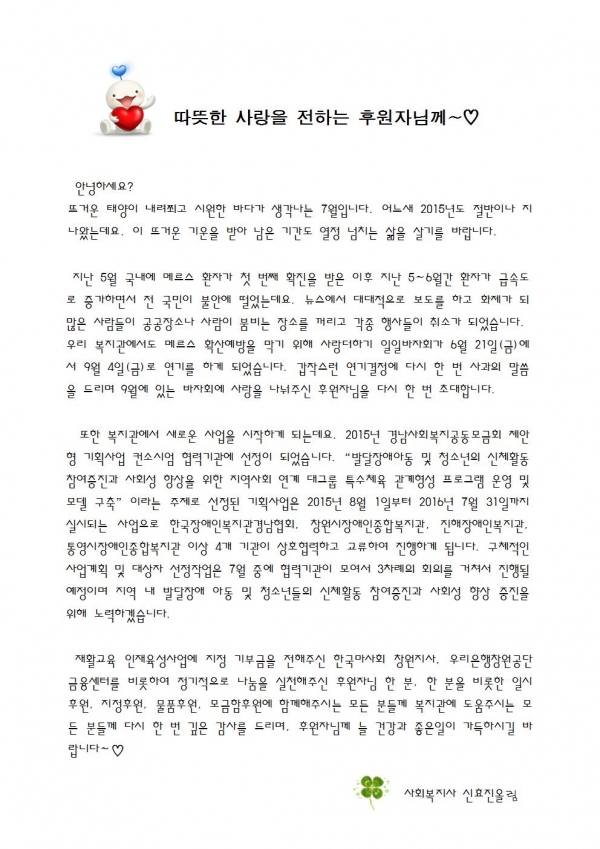 2015년 7월 후원감사편지입니다. 페이지 정보 작성자 신효진 댓글 0건 조회 6,707회 작성일 15-07-16 16:38 본문 후원해주셔서 감사합니다.^^ 이전글2015년 7월 후원해주신분들입니다. 15.08.21 다음글2015년 6월 후원해주신분들입니다. 15.07.16 목록 댓글목록 댓글목록 등록된 댓글이 없습니다.
