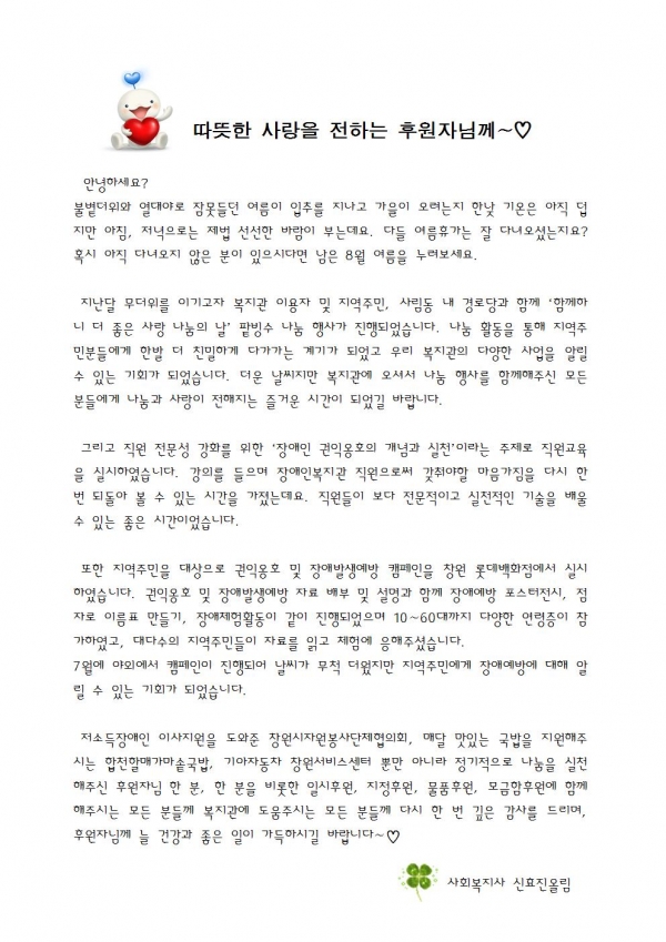 2015년 8월 감사편지입니다. 페이지 정보 작성자 신효진 댓글 0건 조회 6,931회 작성일 15-08-21 11:13 본문 후원해주셔서 감사합니다.^^ 이전글2015년 8월 후원해주신분들입니다. 15.09.21 다음글2015년 7월 후원해주신분들입니다. 15.08.21 목록 댓글목록 댓글목록 등록된 댓글이 없습니다.
