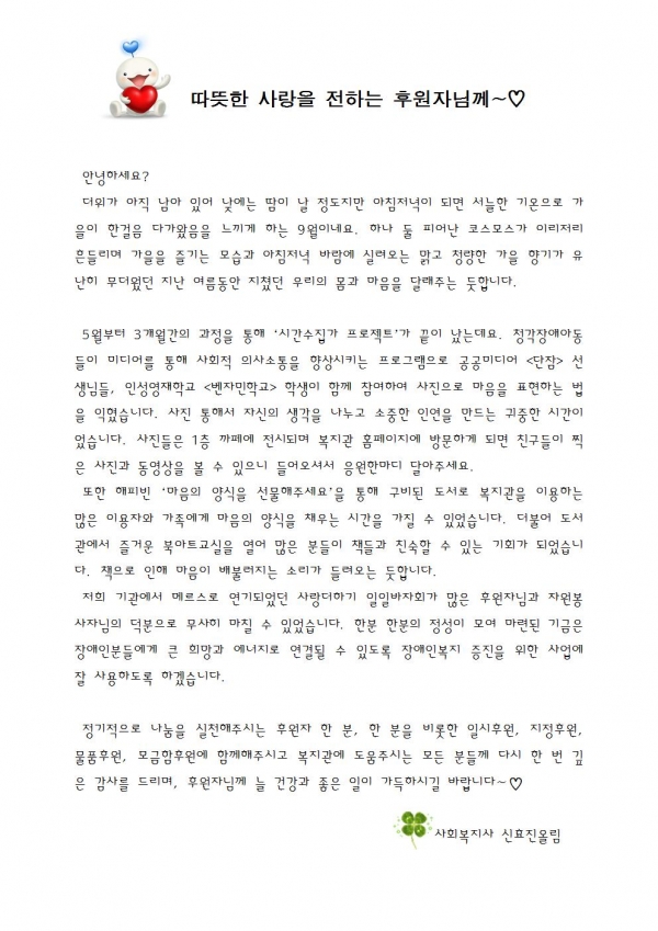 2015년 9월 후원감사편지입니다. 페이지 정보 작성자 신효진 댓글 0건 조회 6,519회 작성일 15-09-21 10:24 본문 후원해 주셔서 감사합니다^^ 이전글2015년 9월 후원해주신분들입니다. 15.10.20 다음글2015년 8월 후원해주신분들입니다. 15.09.21 목록 댓글목록 댓글목록 등록된 댓글이 없습니다.