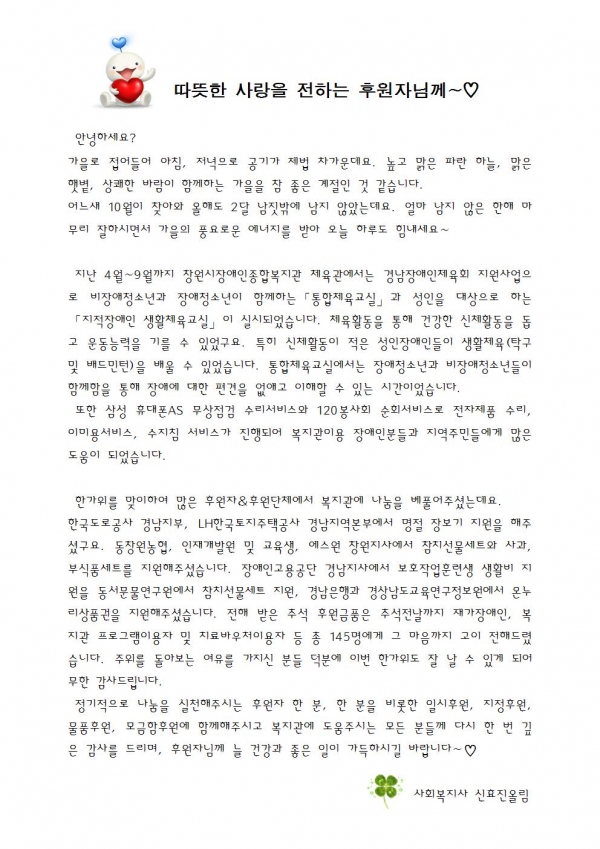 2015년 10월 후원감사편지입니다. 페이지 정보 작성자 신효진 댓글 0건 조회 7,018회 작성일 15-10-20 10:52 본문 후원해 주셔서 감사합니다.^^ 이전글2015년 10월 후원해주신분들입니다 15.11.18 다음글2015년 9월 후원해주신분들입니다. 15.10.20 목록 댓글목록 댓글목록 등록된 댓글이 없습니다.