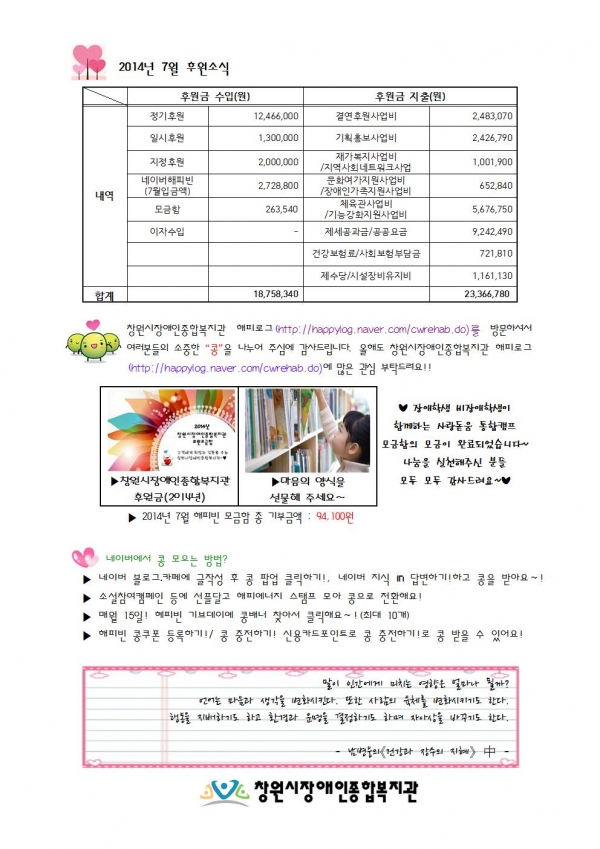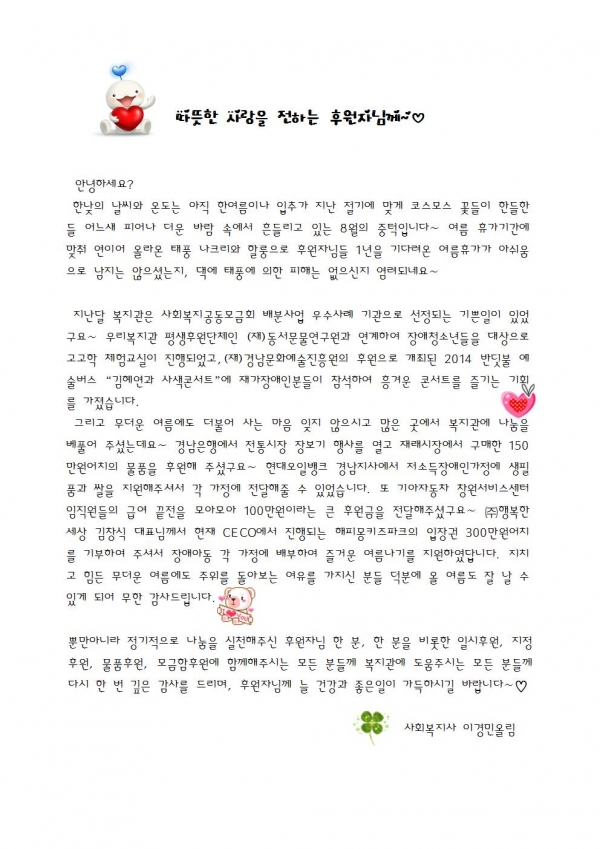 2014년 8월 후원감사편지입니다 페이지 정보 작성자 이경민 댓글 0건 조회 7,339회 작성일 14-08-19 15:15 본문 늘 감사드립니다. ♡ 이전글2014년 8월 후원해주신분들입니다. 14.09.26 다음글2014년 7월 후원해주신분들입니다. 14.08.19 목록 댓글목록 댓글목록 등록된 댓글이 없습니다.