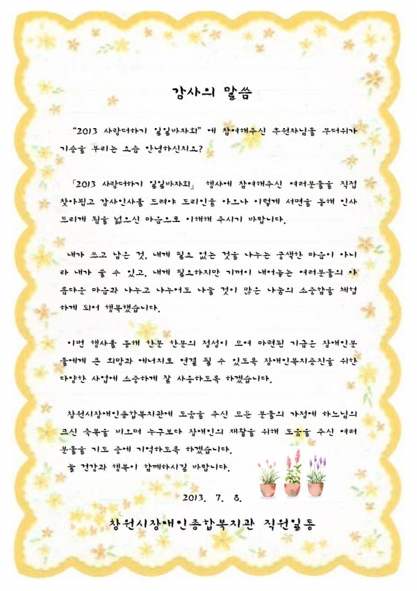 2013년 사랑더하기 일일바자회 감사글 페이지 정보 작성자 이경민 댓글 0건 조회 8,640회 작성일 13-08-07 16:35 본문 이전글2013년 7월 후원감사편지 13.08.07 다음글2013년 5월 후원해주신분들입니다. 13.07.03 목록 댓글목록 댓글목록 등록된 댓글이 없습니다.