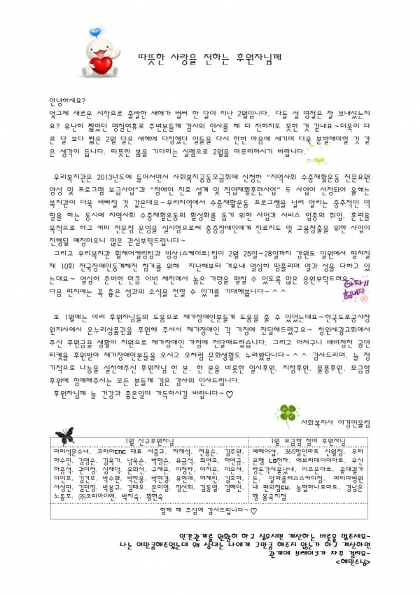 2013년 2월 후원감사편지 페이지 정보 작성자 이경민 댓글 0건 조회 7,788회 작성일 13-02-18 17:47 본문 이전글2012년 12월~2013년 1월 후원해주신분들입니다. 13.02.28 다음글2013년 1월 후원감사편지 13.02.18 목록 댓글목록 댓글목록 등록된 댓글이 없습니다.