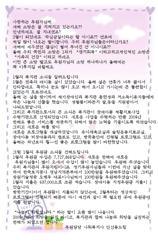 2009년 2월 후원감사편지입니다. 페이지 정보 작성자 운영자 댓글 0건 조회 8,112회 작성일 09-02-23 10:52 본문 2009년 2월 후원감사편지입니다. 이전글2009년 2월에 후원해주신 분들입니다. 감사합니다. 09.03.16 다음글2009년 1월 후원해주신분들입니다. 감사합니다. 09.02.09 목록 댓글목록 댓글목록 등록된 댓글이 없습니다.