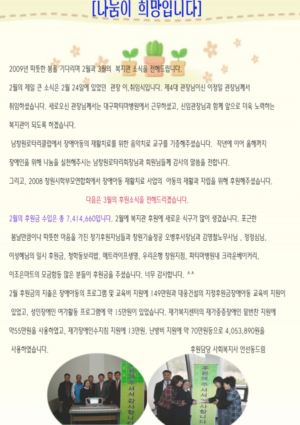 2009년 3월 후원감사편지입니다. 페이지 정보 작성자 운영자 댓글 0건 조회 8,622회 작성일 09-03-18 17:39 본문 2009년 3월 후원감사편지입니다. 이전글2009년 4월 후원감사편지 입니다. 09.04.28 다음글2009년 2월에 후원해주신 분들입니다. 감사합니다. 09.03.16 목록 댓글목록 댓글목록 등록된 댓글이 없습니다.