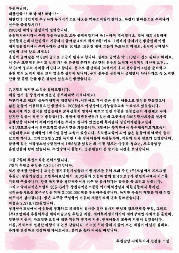 2008년 7월 후원감사편지 입니다 페이지 정보 작성자 운영자 댓글 0건 조회 8,355회 작성일 08-08-14 13:33 본문 <DIV id=memo_cv77>후원자님의 사랑 감사합니다 *글자가 잘 보이지 않으시죠 화면을 클릭하세요*</DIV> 이전글복지관 후원(특별회원)단체인 창원기술정공 경남신문 보도자료 08.08.27 다음글2008년 7월에 후원해주신 분들입니다. 감사합니다. 08.08.07 목록 댓글목록 댓글목록 등록된 댓글이 없습니다.