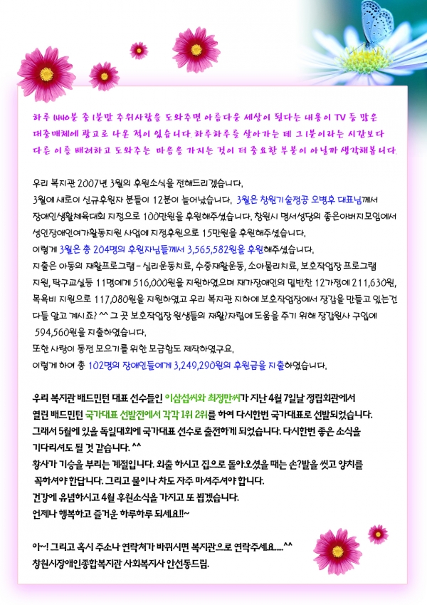 2007년 3월 후원감사편지입니다. 페이지 정보 작성자 운영자 댓글 0건 조회 6,897회 작성일 07-04-10 13:23 본문 .. 이전글2007년 3월 후원해주신 분들입니다. 07.04.16 다음글2007년 2월 후원해주신 분들입니다. 07.03.09 목록 댓글목록 댓글목록 등록된 댓글이 없습니다.