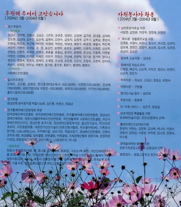 후원 및 자원봉사현황(2004년 3월 - 8월) 페이지 정보 작성자 운영자 댓글 0건 조회 7,364회 작성일 04-11-18 13:46 본문 후원 및 자원봉사현황(2004년 3월 - 8월) 이전글2004년 11월 후원자 현황 04.12.03 다음글10월 후원 감사 편지 04.11.05 목록 댓글목록 댓글목록 등록된 댓글이 없습니다.