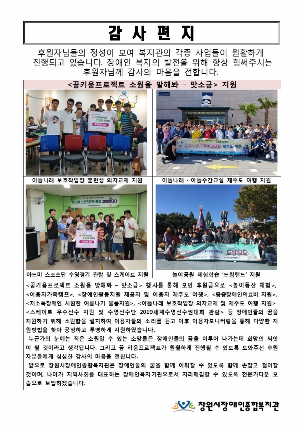 2019년 9월 후원감사편지입니다. 페이지 정보 작성자 김민호 댓글 0건 조회 4,531회 작성일 20-05-19 12:40 본문 2019년 9월 후원감사편지입니다. 이전글2019년 10월 후원감사편지입니다. 20.05.19 다음글2019년 8월 후원감사편지입니다. 19.09.25 목록 댓글목록 댓글목록 등록된 댓글이 없습니다.