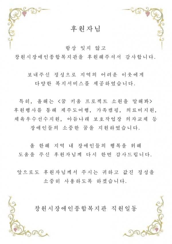 2019년 11월 후원감사편지입니다. 페이지 정보 작성자 김민호 댓글 0건 조회 6,412회 작성일 20-05-19 12:44 본문 2019년 11월 후원감사편지입니다. 이전글2019년 12월 후원감사편지입니다. 20.05.19 다음글2019년 10월 후원감사편지입니다. 20.05.19 목록 댓글목록 댓글목록 등록된 댓글이 없습니다.