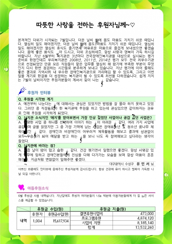 2017년 6월 감사편지입니다. 페이지 정보 작성자 김준수 댓글 0건 조회 6,139회 작성일 17-07-13 14:36 본문 후원해주셔서 감사드립니다. 이전글2017년 7월 후원자 현황입니다. 17.08.10 다음글2017년 6월 후원자현황입니다. 17.07.07 목록 댓글목록 댓글목록 등록된 댓글이 없습니다.