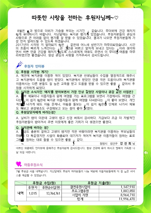 2017년 7월 후원감사편지입니다. 페이지 정보 작성자 김준수 댓글 0건 조회 6,053회 작성일 17-08-30 18:02 본문 후원해주셔서 감사합니다. 이전글2017년 8월 후원자현황입니다. 17.09.19 다음글2017년 7월 후원자 현황입니다. 17.08.10 목록 댓글목록 댓글목록 등록된 댓글이 없습니다.