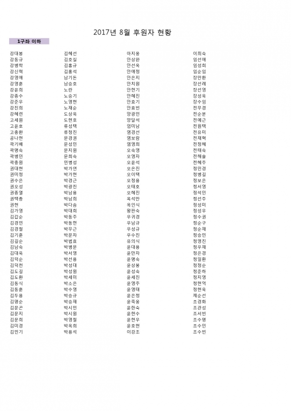2017년 8월 후원자현황입니다. 페이지 정보 작성자 김준수 댓글 0건 조회 5,783회 작성일 17-09-19 09:33 본문 후원해주셔서 감사합니다. 이전글2017년 8월 후원감사편지입니다. 17.09.19 다음글2017년 7월 후원감사편지입니다. 17.08.30 목록 댓글목록 댓글목록 등록된 댓글이 없습니다.