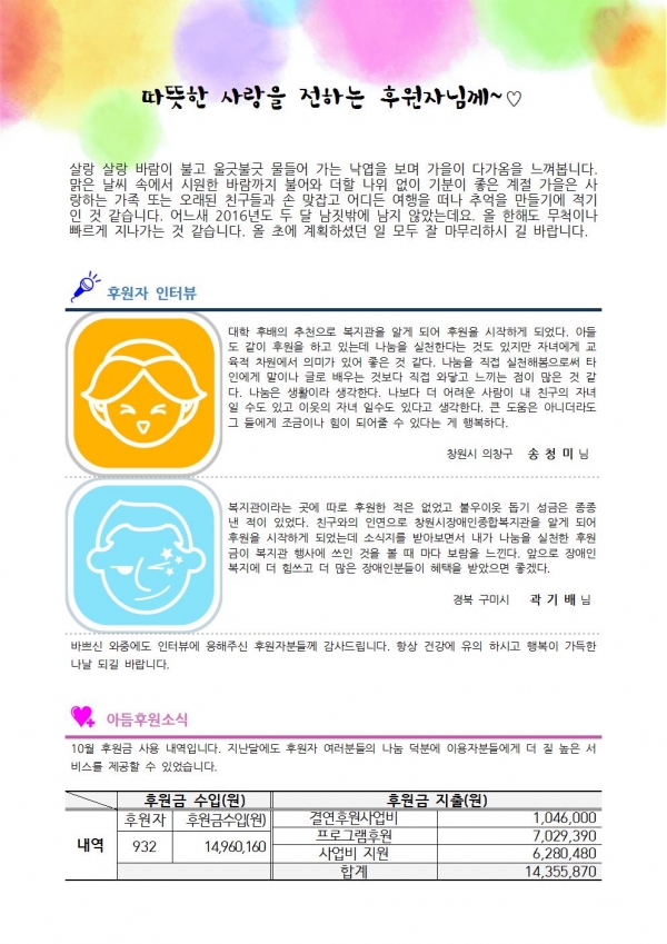 2016년 10월 후원감사편지입니다. 페이지 정보 작성자 김준수 댓글 0건 조회 7,329회 작성일 16-11-23 14:43 본문 후원해주셔서 감사합니다. 이전글2016년 11월 후원자현황입니다. 16.12.19 다음글2016년 10월 후원자 현황입니다. 16.11.08 목록 댓글목록 댓글목록 등록된 댓글이 없습니다.
