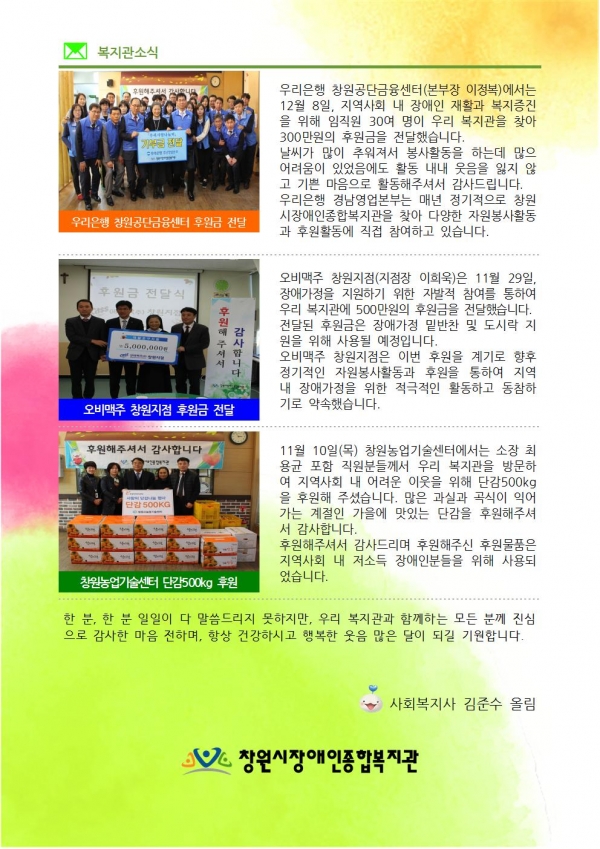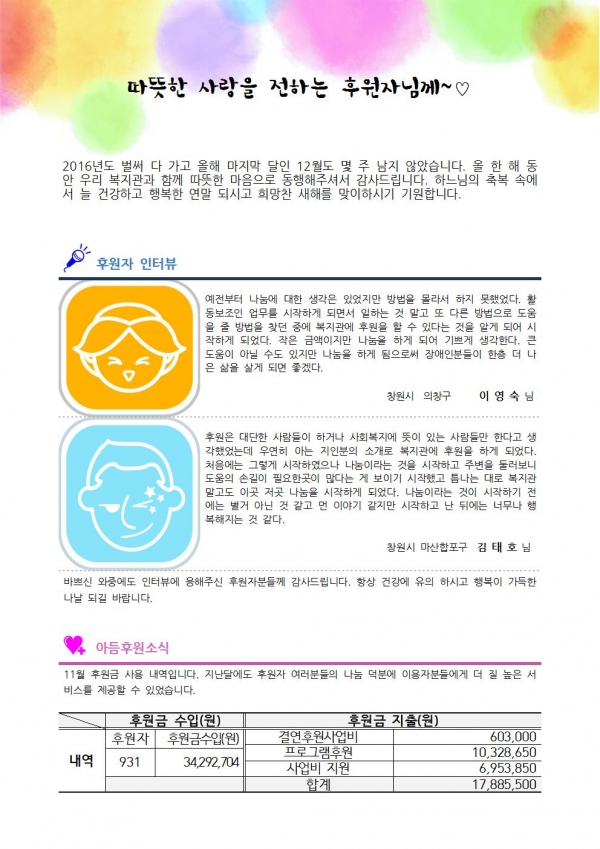 2016년 11월 후원감사편지입니다. 페이지 정보 작성자 김준수 댓글 0건 조회 7,559회 작성일 17-01-05 14:34 본문 후원해주셔서 감사합니다. 이전글2016년 12월 감사편지입니다. 17.03.02 다음글2016년 11월 후원자현황입니다. 16.12.19 목록 댓글목록 댓글목록 등록된 댓글이 없습니다.