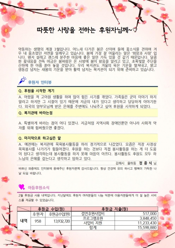2017년 2월 후원자감사편지입니다. 페이지 정보 작성자 김준수 댓글 0건 조회 7,015회 작성일 17-04-05 09:02 본문 후원해주셔서 감사합니다. 이전글2017년 3월 후원자현황 17.04.19 다음글2017년 2월 후원자현황입니다. 17.03.13 목록 댓글목록 댓글목록 등록된 댓글이 없습니다.