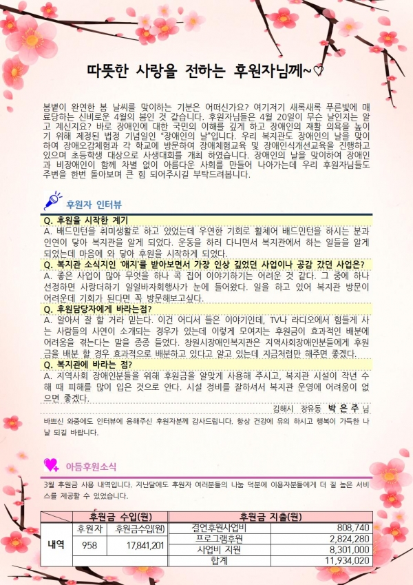 2017년 3월 후원자감사편지입니다. 페이지 정보 작성자 김준수 댓글 0건 조회 7,534회 작성일 17-05-19 16:13 본문 후원해주셔서 감사합니다. 이전글2017년 4월 후원자감사편지입니다. 17.05.19 다음글 2017년 4월 후원자현황 17.05.19 목록 댓글목록 댓글목록 등록된 댓글이 없습니다.
