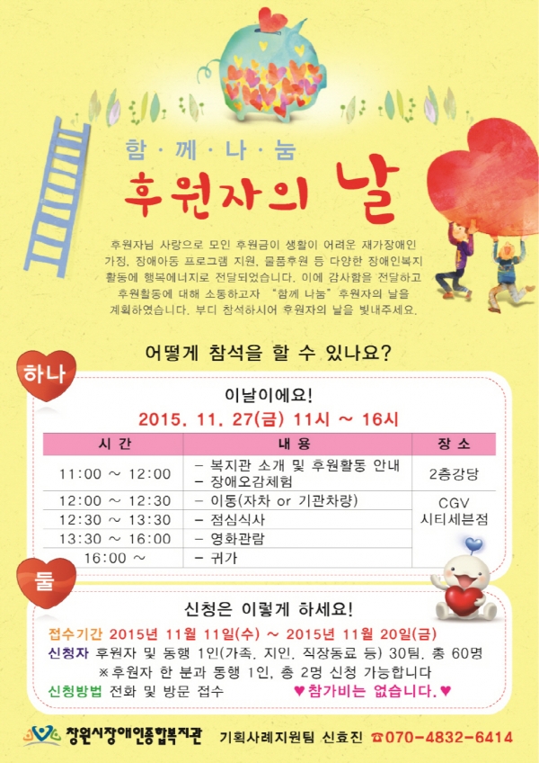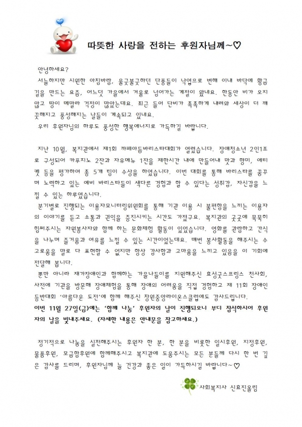 2015년 11월 후원감사편지입니다. 페이지 정보 작성자 신효진 댓글 0건 조회 6,841회 작성일 15-11-18 11:55 본문 후원해주셔서 감사합니다^^ 이전글2015년 11월 후원해주신분들입니다 15.12.16 다음글2015년 10월 후원해주신분들입니다 15.11.18 목록 댓글목록 댓글목록 등록된 댓글이 없습니다.