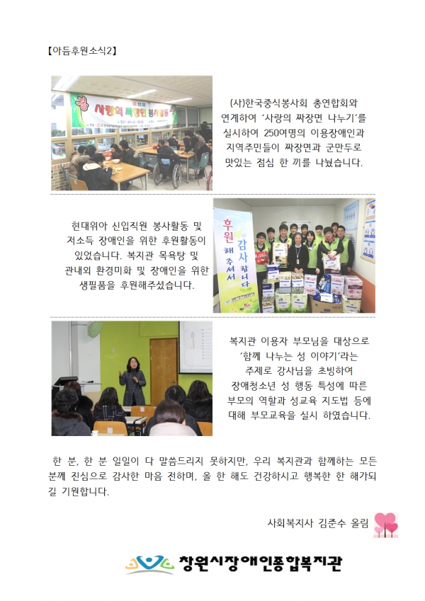 2016년 2월 후원감사편지입니다. 페이지 정보 작성자 김준수 댓글 0건 조회 6,193회 작성일 16-02-23 14:51 본문 후원해주셔서 감사합니다. ^^ 이전글2016년 1월 후원자현황입니다. 16.02.29 다음글2016년 1월 후원감사편지입니다. 16.01.22 목록 댓글목록 댓글목록 등록된 댓글이 없습니다.