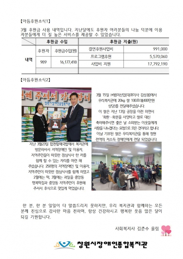 2016년 4월 후원감사편지입니다. 페이지 정보 작성자 김준수 댓글 0건 조회 6,221회 작성일 16-04-20 15:55 본문 후원해주셔서 감사합니다. 이전글2016년 3월 후원자현황입니다. 16.05.20 다음글2016년 2월 후원자현황입니다. 16.04.20 목록 댓글목록 댓글목록 등록된 댓글이 없습니다.