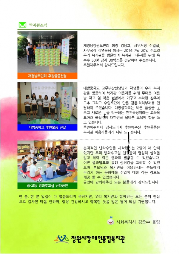 2016년 7월 후원감사편지입니다. 페이지 정보 작성자 김준수 댓글 0건 조회 6,842회 작성일 16-08-16 14:53 본문 후원해주셔서 감사합니다. 이전글2016년 8월 후원자현황입니다. 16.09.29 다음글2016년 7월 후원자현황입니다. 16.08.16 목록 댓글목록 댓글목록 등록된 댓글이 없습니다.