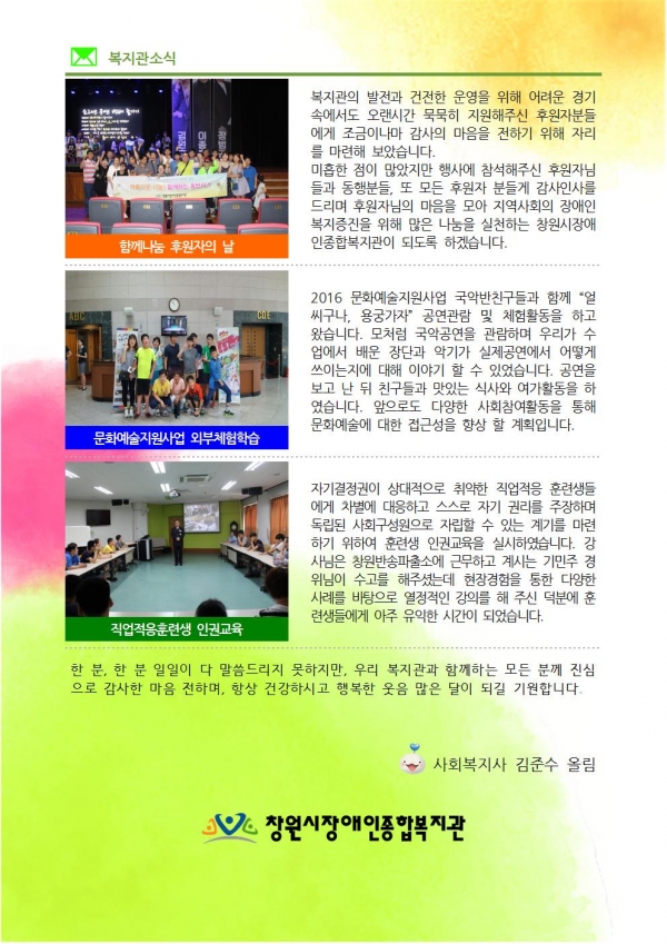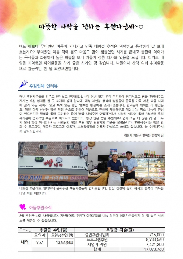 2016년 8월 후원감사편지입니다. 페이지 정보 작성자 김준수 댓글 0건 조회 6,721회 작성일 16-09-29 14:24 본문 후원해주셔서 감사합니다. 이전글2016년 9월 감사편지입니다. 16.10.20 다음글2016년 8월 후원자현황입니다. 16.09.29 목록 댓글목록 댓글목록 등록된 댓글이 없습니다.